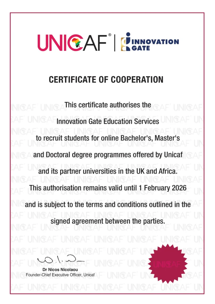 Unicaf University was established in 2012 as a private, international institution, delivering accessible higher education through online and on-campus programs across Africa and beyond.